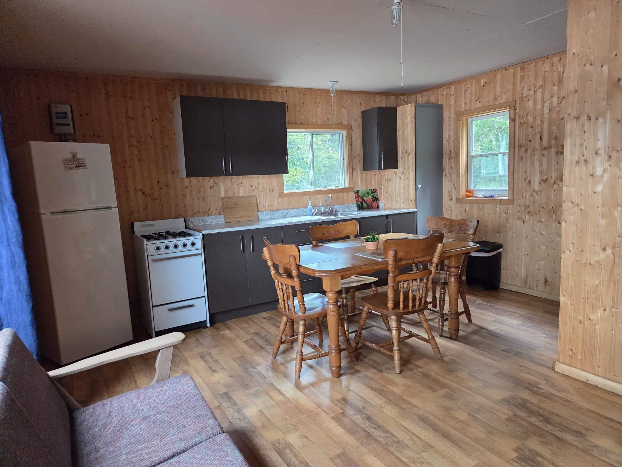 Designed to comfortably host up to 6 guests, the chalet features two bedrooms: one with a cozy bunk Queen bed for four people, and another with two single bunk beds for two guests. The modern amenities ensure a comfortable stay, including a fully equipped kitchen with dishware, a fridge, and a gas stove. Enjoy the outdoors with your own BBQ, relax on the patio, or gather around the fire pit for memorable evenings under the stars.